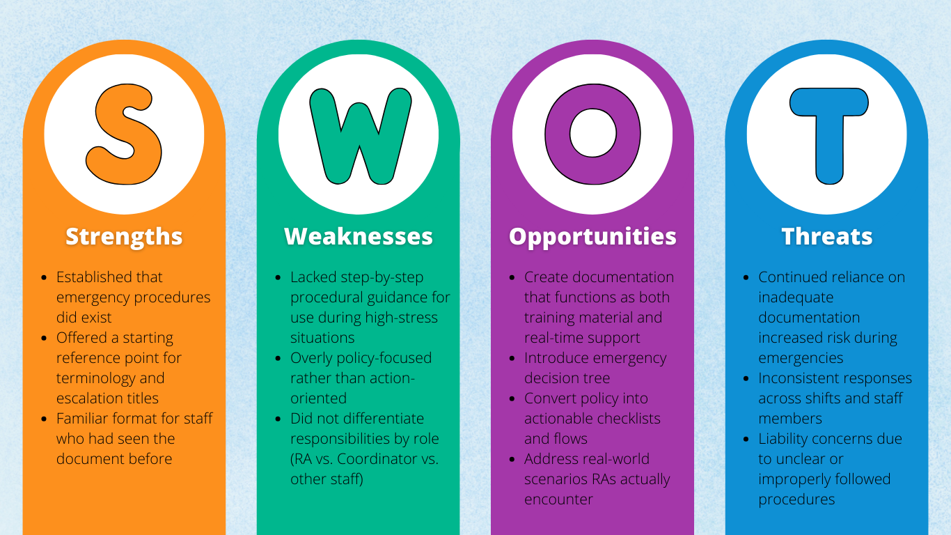 Before creating new documentation, I conducted an audit of existing emergency documentation using a SWOT-style document analysis to identify gaps, risks, and opportunities.